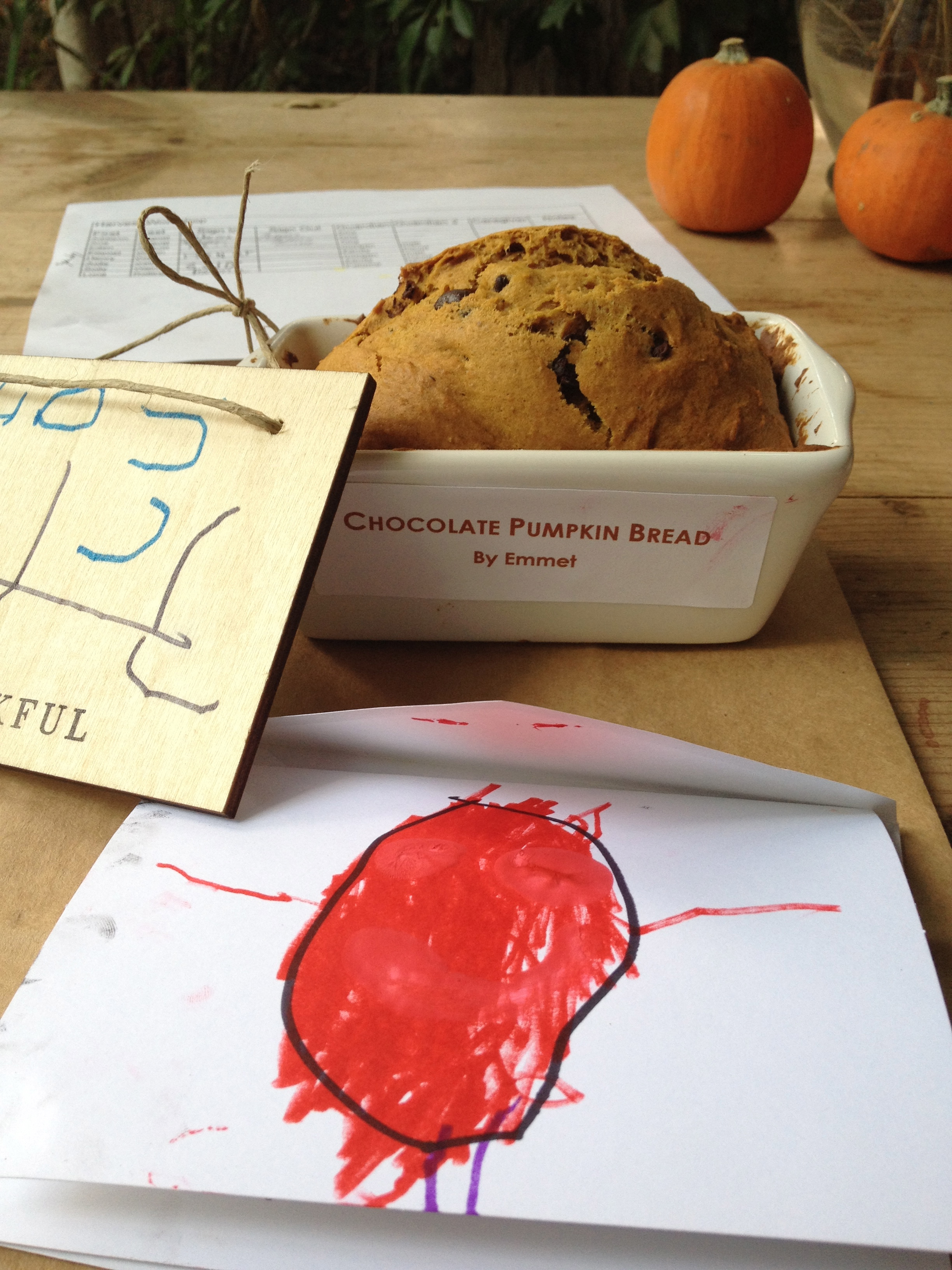 The kids, Naty and I also made some DELICIOUS pumpkin chocolate chip bread. I mean, this stuff was DELICIOUS – the kids did a great job. I ate it non-stop for the rest of the day! I hope you enjoyed it too!